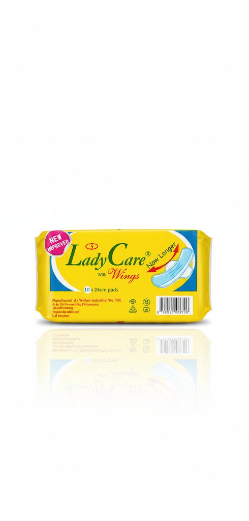 Lady Care with Wings (pads) absorbs menstrual flow for protection and comfort by using a highly absorbent, cotton-like surface and adhesive wings to secure the pad in place, keeping you dry and stain-free during your period